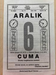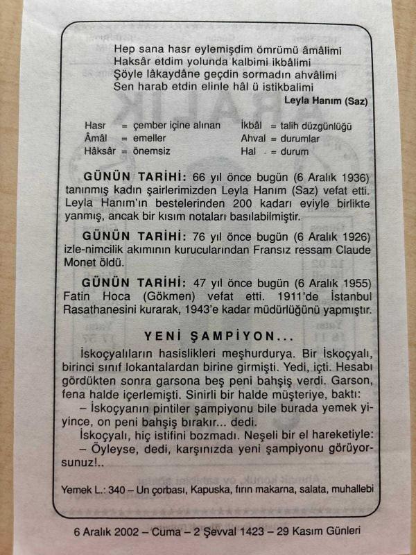 6 ARALIK 2002 - TAKVİM YAPRAĞI - DOĞUM GÜNÜ HEDİYESİ - BÜYÜK SAATLİ MAARİF TAKVİMİ - KAŞGARLI MAHMUT - LEYLA HANIM - KADIN ŞAİRLERİMİZDEN LEYLA HANIM VEFAT ETTİ - FRANSIZ RESSAM CLAUDE MONET ÖLDÜ - FATİN HOCA(GÖKMEN) VEFAT ETTİ - YENİ ŞAMPİYON ADLI YAZI, en son 8 ay önce güncellenmiştir.