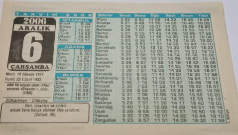 6 Aralık 2006-Orijinal Takvim Yaprağı-Doğum Günü-Söz,Nişan,Nikâh,Düğün ve Önemli Günler Hediyesi-Bizim Anadolu Takvimleri-Ayet(Zariyat:56)-ABD 56 kişiye idam infazı vererek dünyada 1. oldu(1995)-Zülkarneyn;Züleyha-İslamda Zaman Tanzimi başlıklı ürün, Efemera, Müzik, Sinema > Belge ve Evraklar > Takvimler kategorisi altında İkinci El olarak satılmaktadır.