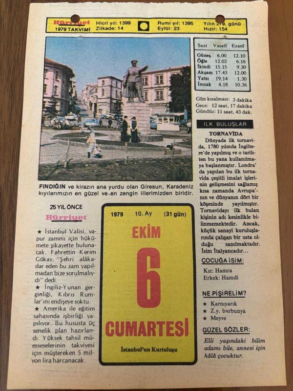 6 EKİM 1979 - TAKVİM YAPRAĞI - DOĞUM GÜNÜ HEDİYESİ - HÜRRİYET TAKVİMİ - PİS BİR İŞ ROMANI - İstanbul'un düşman işgalinden kurtuluşu - Kars'ta "Atatürk'ün Gelişini Anma Günü" - Edebiyatçı Sabri Esat Sivayuşgil'in ölümü - Turhal Şeker Fabrikası'nın temal atma töreni başlıklı ürün, Efemera, Müzik, Sinema > Belge ve Evraklar > Takvimler kategorisi altında İkinci El olarak satılmaktadır.