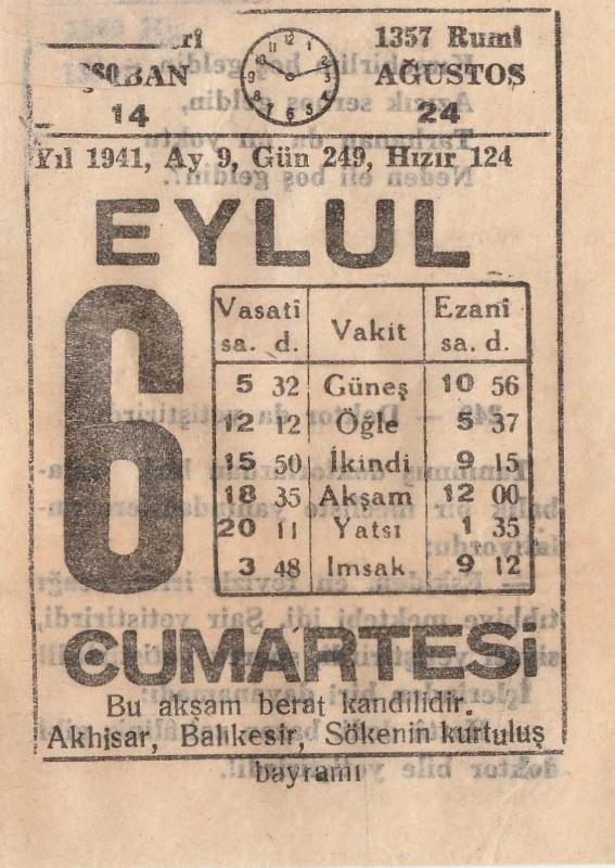6 EYLÜL 1941 SAATLİ MAARİF TAKVİMİ YAPRAĞI, en son 2 ay önce güncellenmiştir.