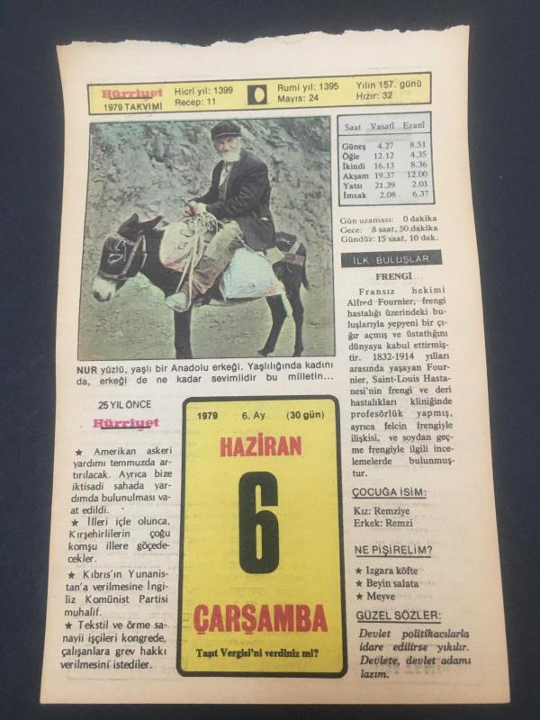 6 HAZİRAN 1979-TAKVİM YAPRAĞI-DOĞUM GÜNÜ HEDİYESİ-HÜRRİYET TAKVİMİ,ADALET PARTİSİ KURUCULARINDAN ORG RAGIP GÜMÜŞPALANIN ÖLÜMÜ 1969,İHTİYARLIK SİGORTASININ KABULÜ 1949,LÜLEBURGAZ AHMETBEY BUCAĞI PANAYIRI başlıklı ürün, Efemera, Müzik, Sinema > Belge ve Evraklar > Takvimler kategorisi altında İkinci El olarak satılmaktadır.