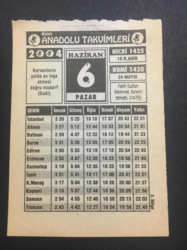 6 HAZİRAN 2004 -TAKVİM YAPRAĞI-DOĞUM GÜNÜ HEDİYESİ-BİZİM ANADOLU TAKVİMLERİ,FATİH SULTAN MEHMET KIRIMI FETH ETTİ,1475,DEPREM TEDBİRLERİ,NÜKTEİBİBER MEHMED PAŞA başlıklı ürün, Efemera, Müzik, Sinema > Belge ve Evraklar > Takvimler kategorisi altında İkinci El olarak satılmaktadır.
