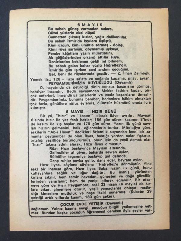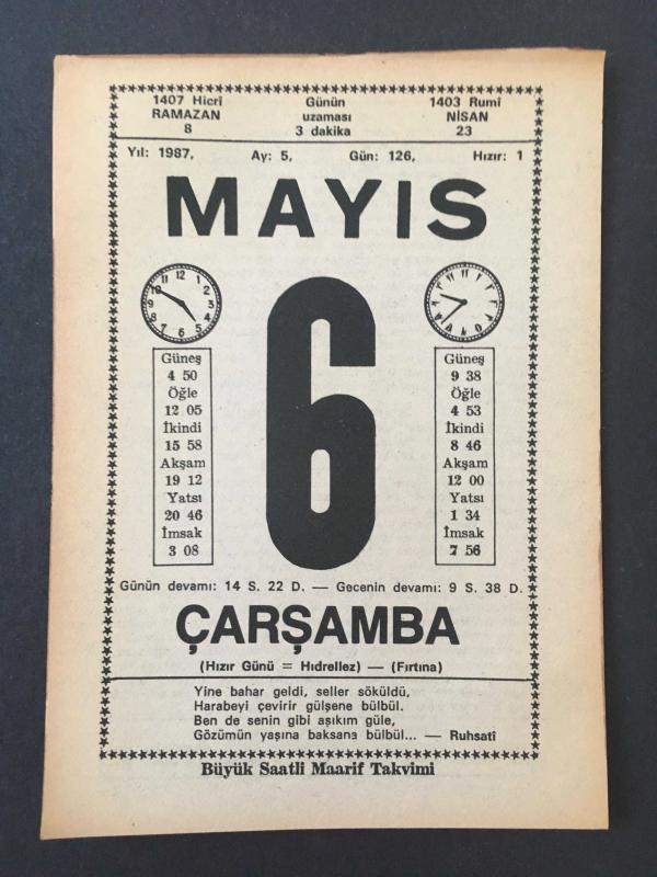 6 MAYIS 1987 -TAKVİM YAPRAĞI-DOĞUM GÜNÜ HEDİYESİ-BÜYÜK SAATLİ MAARİF TAKVİMİ,HIZIR GÜNÜ HIDIRELLEZ,FIRTINA,6MAYIS,PEYGAMBERİMİZİN BÜYÜKLÜĞÜ,6 MAYIS HIZIR GÜNÜ,ÇOCUK EVDE YETİŞİR, en son 8 ay önce güncellenmiştir.