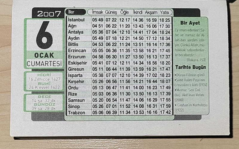 6 OCAK 2007 CUMARTESİ - TAKVİM YAPRAĞI - DOĞUM GÜNÜ HEDİYESİ - TÜRMATSAN TAKVİMİ - DÜNYA FİLİSTİN GÜNÜ- SAHİT HALİM PAŞA'NIN ERMENİLERCE KATLİ (1924)- MEMUR-SEN GNL. BAŞ. AKİF İNAN VEFATI (2000)- CEYHAN'IN KUTRULUŞU (1922)-VERGİ-BENDE BEŞERİM başlıklı ürün, Efemera, Müzik, Sinema > Belge ve Evraklar > Takvimler kategorisi altında İkinci El olarak satılmaktadır.