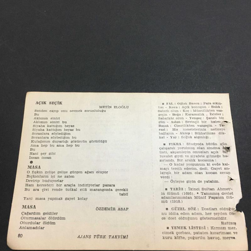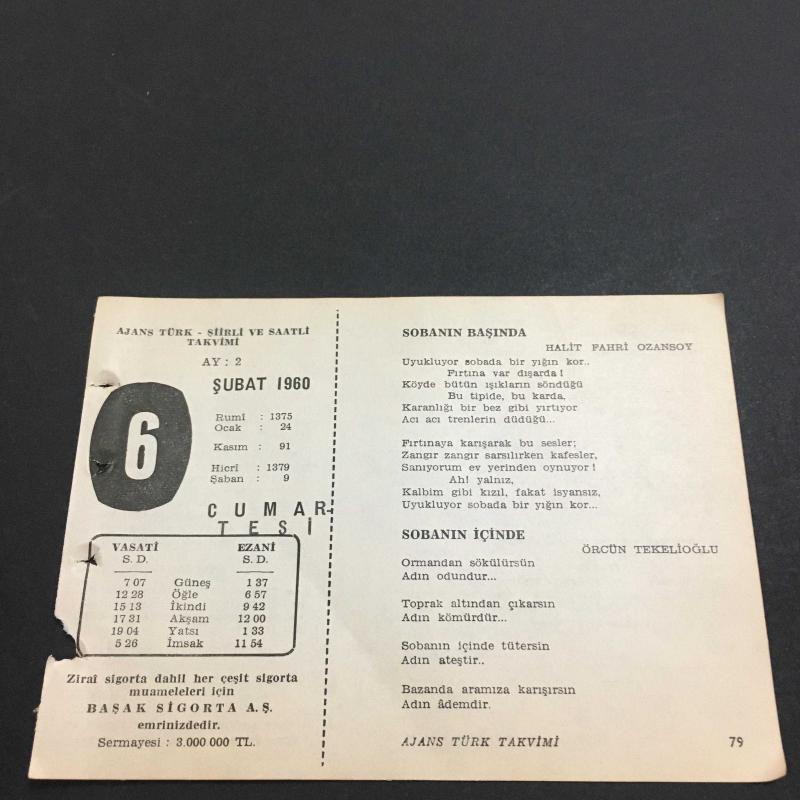 6 ŞUBAT 1960 -TAKVİM YAPRAĞI-DOĞUM GÜNÜ HEDİYESİ-AJANS TÜRK-ŞİİRLİ VE SAATLİ TAKVİMİ,HALİT FAHRİ OZANSOY,ÖRCÜN TEKELİOĞLU,METİN ELOĞLU,ÖZDEMİR ASAF,FAL,FIFRA,2.SULTAN AHMETİN ÖLÜMÜ,1695,MÜNİF PAŞANIN ÖLÜMÜ 1910,GÜZEL SÖZ,YEMEK LİSTESİ başlıklı ürün, Efemera, Müzik, Sinema > Belge ve Evraklar > Takvimler kategorisi altında İkinci El olarak satılmaktadır.
