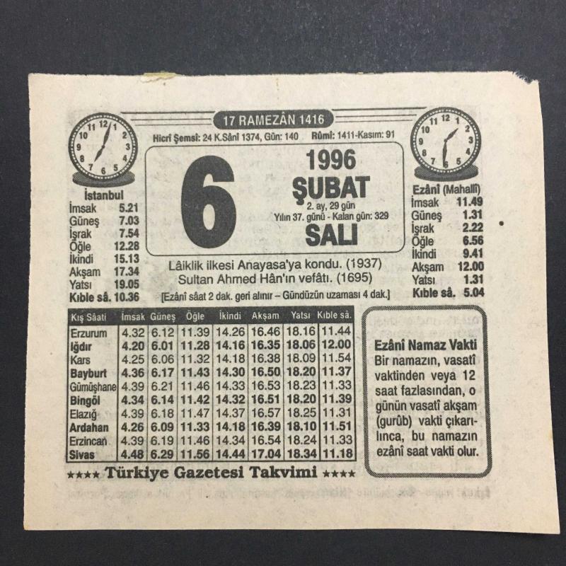 6 ŞUBAT 1996 -TAKVİM YAPRAĞI-DOĞUM GÜNÜ HEDİYESİ-TÜRKİYE GAZETESİ TAKVİMİ,LAİKLİK İLKESİ ANAYASAYA KONDU,1937,SULTAN AHMET HANIN VEFATI 1695,PEYNİR başlıklı ürün, Efemera, Müzik, Sinema > Belge ve Evraklar > Takvimler kategorisi altında İkinci El olarak satılmaktadır.