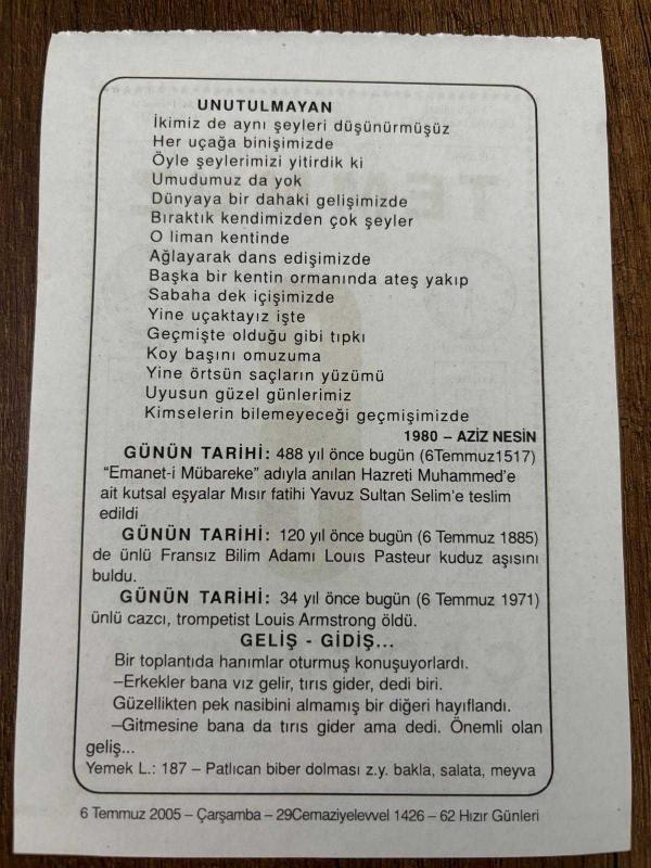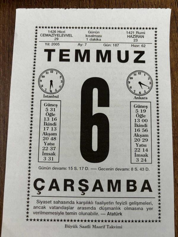 6 TEMMUZ 2005 - TAKVİM YAPRAĞI - DOĞUM GÜNÜ HEDİYESİ - BÜYÜK SAATLİ MAARİF TAKVİMİ - ATATÜRK - AZİZ NESİN - HZ.MUHAMMED'E AİT KUTSAL EŞYALAR MISIR FATİHİ YAVUZ SULTAN SELİM'E TESLİM EDİLDİ - KUDUZ AŞISI BULUNDU - TROMPETİST LOUİS ARMSTRONG ÖLDÜ, en son 8 ay önce güncellenmiştir.