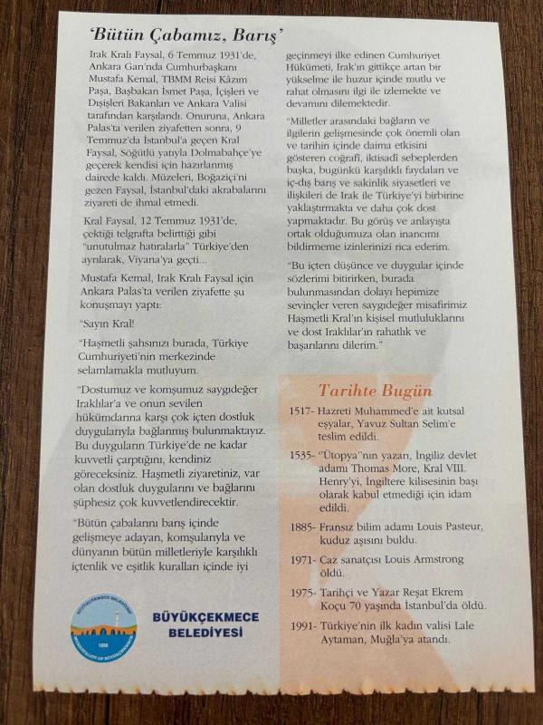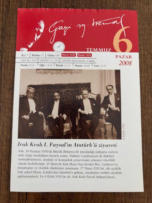 6 TEMMUZ 2008 - TAKVİM YAPRAĞI - DOĞUM GÜNÜ HEDİYESİ - GAZİ MUSTAFA KEMAL ATATÜRK FOTOĞRAFLI BÜYÜKÇEKMECE BELEDİYESİ TAKVİMİ - Irak Kralı I. Faysal'ın Atatürk'ü ziyareti - 'Bütün Çabamız, Barış' - 1517- Hazreti Muhammed'e ait kutsal eşyalar, Yavuz Sultan Selim'eteslim edildi.-1885- Fransız bilim adamı Louis Pasteur, kuduz aşısını buldu. -1991- Türkiye'nin ilk kadın valisi Lale Aytaman, Muğla'ya atandı., en son 9 ay önce güncellenmiştir.