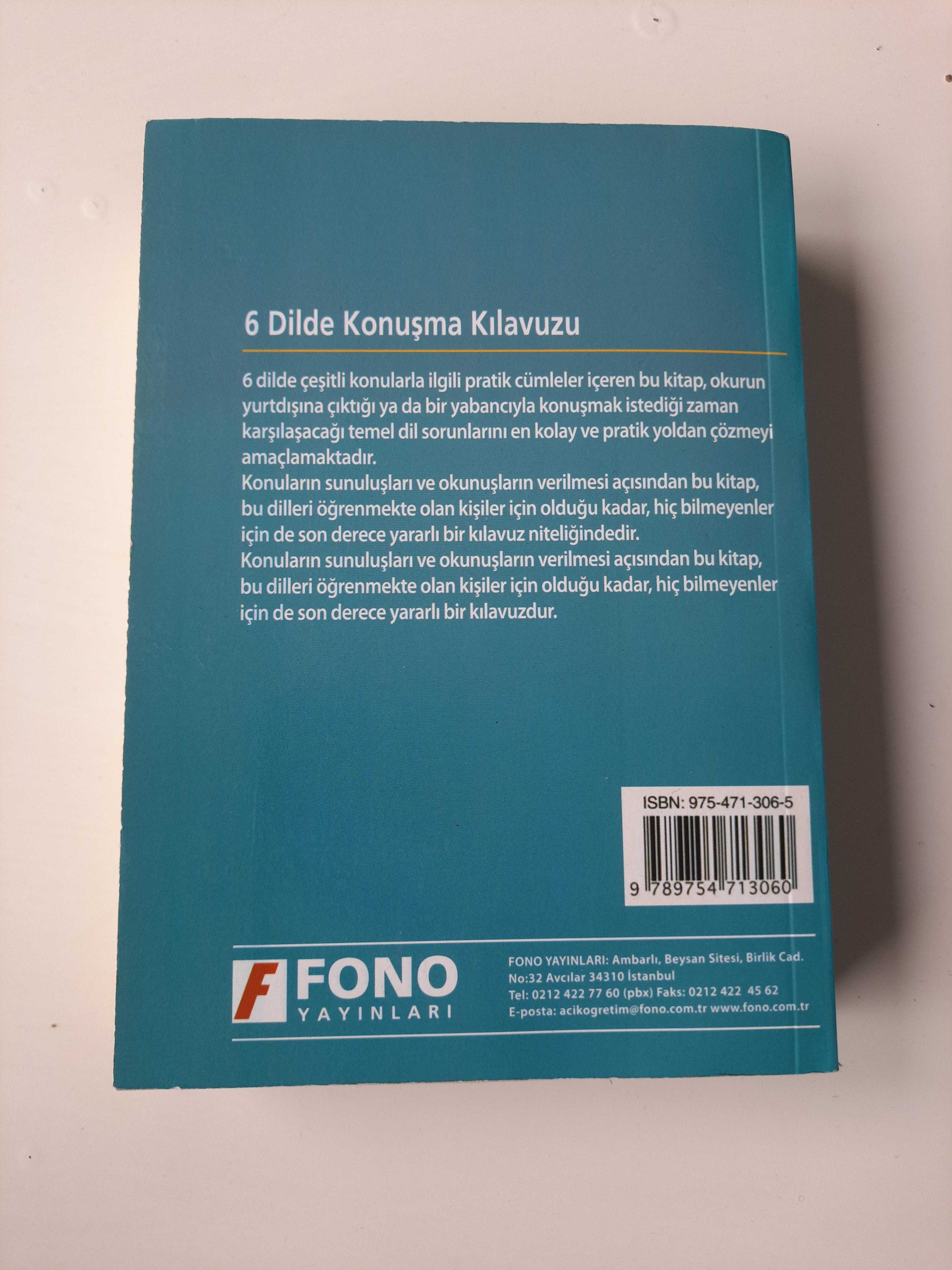 6 dilde konuşma kılavuzu, fono yayınları tarafından kaleme alınmıştır. Kitap fono yayınları tarafından yayınlanmıştır. 6 dilde konuşma kılavuzu adlı eser Türkçe dilindedir.