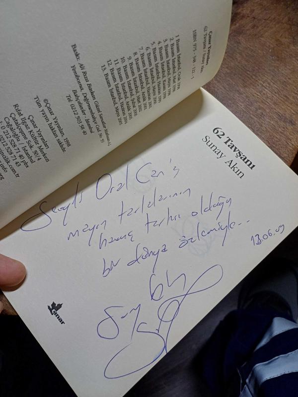 62 Tavşanı İmzalı, Sunay Akın tarafından kaleme alınmıştır. Kitap 2005 yılında Çınar Yayınları tarafından [İstanbul] yayınlanmıştır. 61 sayfadır. 62 Tavşanı İmzalı adlı eser Türkçe dilindedir.