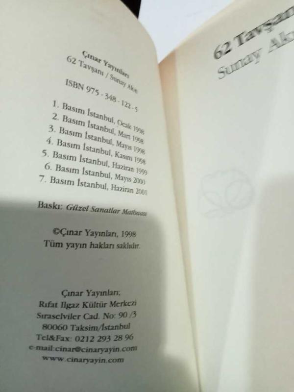 62 Tavşanı, Sunay Akın tarafından kaleme alınmıştır. Kitap 2001 yılında Çınar Yayınları tarafından [İstanbul] yayınlanmıştır. 62 sayfadır. 62 Tavşanı adlı eser Türkçe dilindedir.