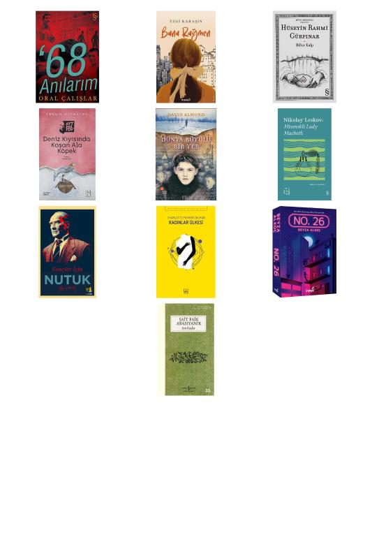 68 Anılarım - Bana Rağmen - Billur Kalp - Deniz Kıyısında Koşan Ala Köpek - Dünya Büyülü Bir Yer - Everest Açıkhava 26 - Mtsenskli Lady Macbeth - Gençler İçin NUTUK - Kadınlar Ülkesi - No. 26 - Son Kuşlar
