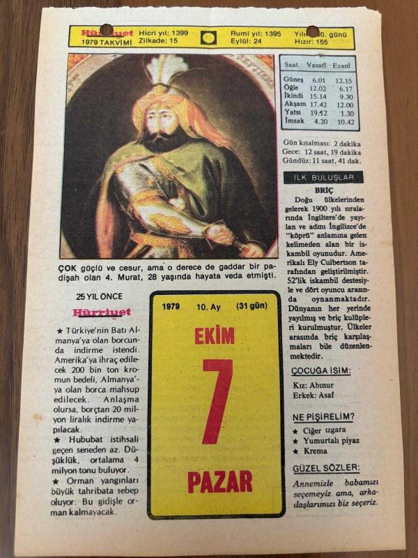 7 EKİM 1979 - TAKVİM YAPRAĞI - DOĞUM GÜNÜ HEDİYESİ - HÜRRİYET TAKVİMİ - PİS BİR İŞ ROMANI - İstanbul'a bağlı Şile'nin "Kurtuluş Günü" - Kars'ın ilçesi Tuzluca'nın "Kurtuluş Günü" - Adapazarı Şeker Fabrikası'nın açılışı (1953) - İnebahtı bozgunu (1671) başlıklı ürün, Efemera, Müzik, Sinema > Belge ve Evraklar > Takvimler kategorisi altında İkinci El olarak satılmaktadır.