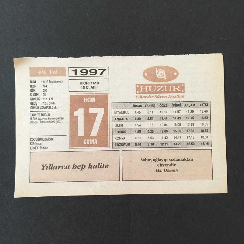 7 EKİM 1997 -TAKVİM YAPRAĞI-DOĞUM GÜNÜ HEDİYESİ-HUZUR TAKVİMİ,İLK TÜRK TUGAYININ KOREYE ÇIKMASI,1950,EDİSONUN ÖLÜMÜ 1931,ÇOCUĞUNUZA İSİM,ÖZÜR DİLEMEK AYIP DEĞİLDİR,HORLAMA başlıklı ürün, Efemera, Müzik, Sinema > Belge ve Evraklar > Takvimler kategorisi altında İkinci El olarak satılmaktadır.