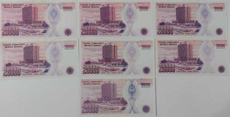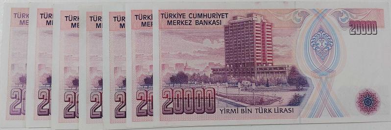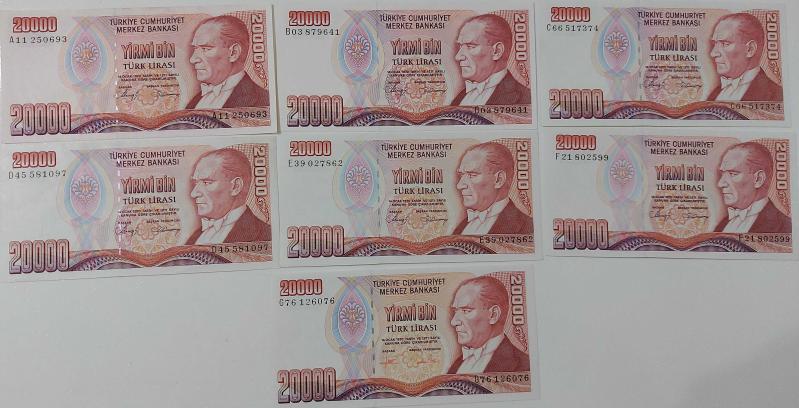 7.EMİSYON 1.TERTİP 20.000 YİRMİ BİN TÜRK LİRASI HARF SIRALI YEDİ ADET ORİJİNAL KAĞIT PARALARDIR BİRİ ÇİLALTI DİĞERLERİ ÇİLDİR ÇOK NADİR, 22 gün önce satışa sunulmuştur.