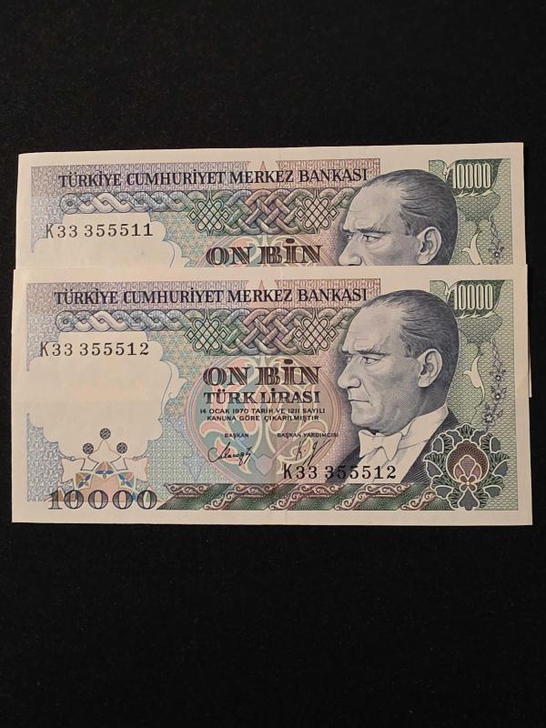 7.EMİSYON 10.000 K33, ÇİL Seri Takipli 2 adet başlıklı ürün, Efemera, Müzik, Sinema > Nümismatik, Para, Madalya > Kağıt Paralar > Cumhuriyet Dönemi > 7. Emisyon kategorisi altında İkinci El olarak satılmaktadır.