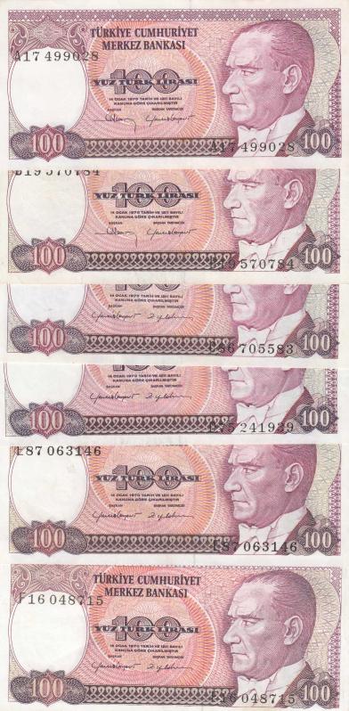 7. EMİSYON A - B -C - D - E - F SERİSİ HARF TAKIM 100 LİRA ( 6 ADET ) / ÇÇT - ÇİL ALTI KONDİSYON