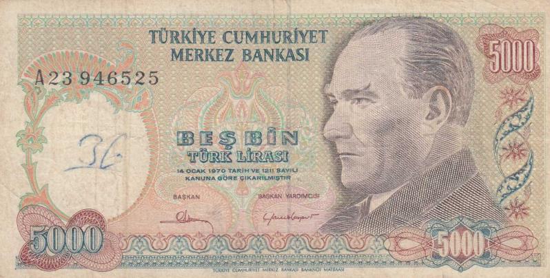7.EMİSYONA 29 SERİSİ KÜÇÜK MEVLANALI 5000 LİRA / ÇOK TEMİZ KONDİSYON - FİLİGRAN BÖLÜMÜNDE MAVİ KALEMLE RAKAM YAZILI