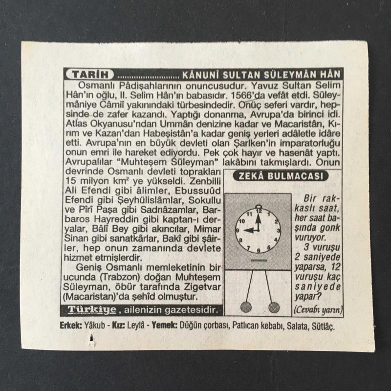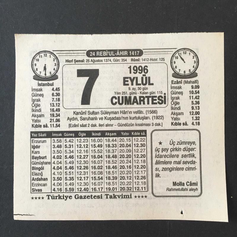 7 EYLÜL 1996 -TAKVİM YAPRAĞI-DOĞUM GÜNÜ HEDİYESİ-TÜRKİYE GAZETESİ TAKVİMİ,KANUNİNİN VEFATI 1566,AYDIN ,SARUHANLI,KUŞADASININ KURTULUŞLARI 1922,KANUNİ SULTAN SÜLEYMAN HAN, başlıklı ürün, Efemera, Müzik, Sinema > Belge ve Evraklar > Takvimler kategorisi altında İkinci El olarak satılmaktadır.