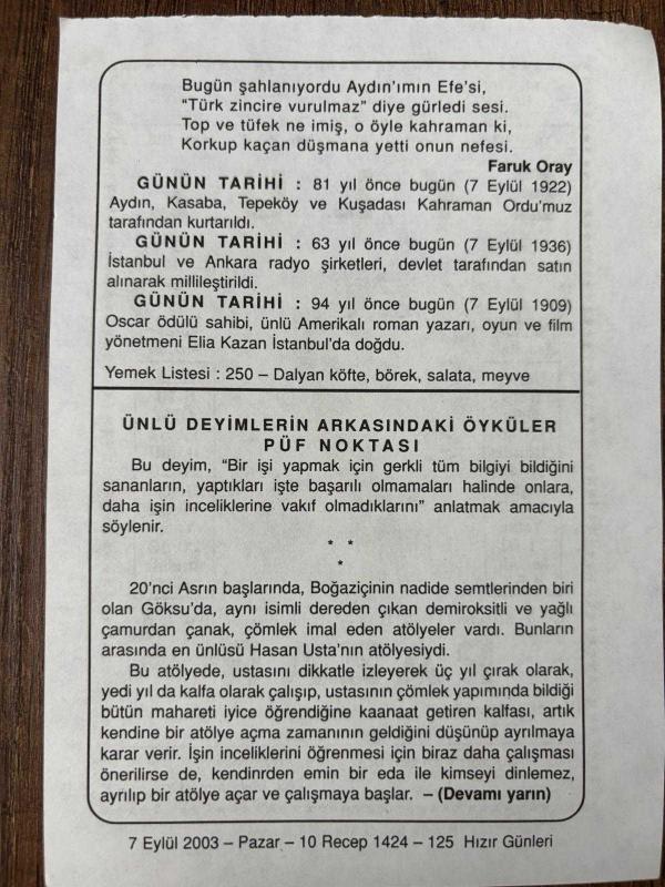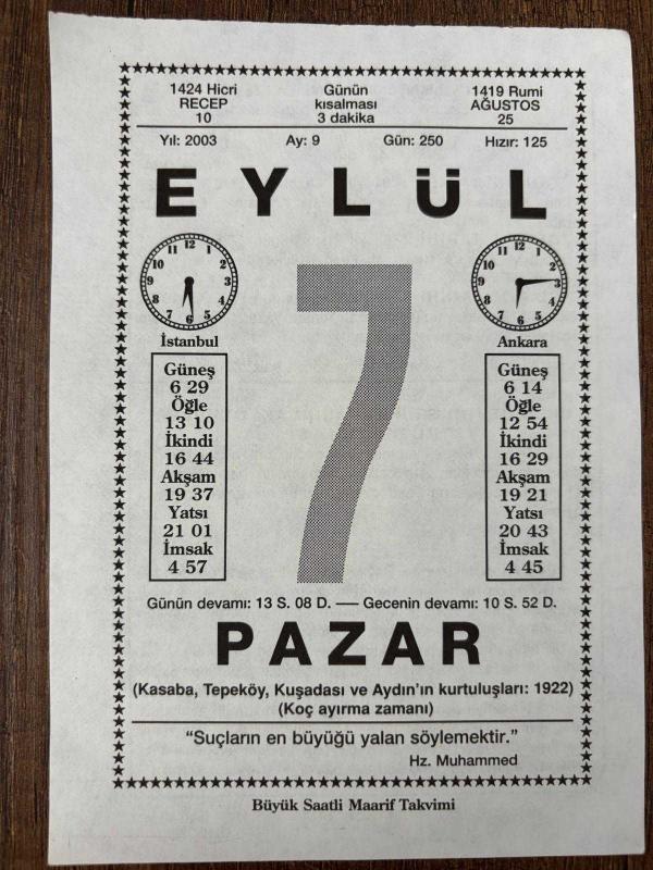 7 EYLÜL 2003 - TAKVİM YAPRAĞI - DOĞUM GÜNÜ HEDİYESİ - BÜYÜK SAATLİ MAARİF TAKVİMİ - HZ.MUHAMMED - AYDIN,KASABA,TEPEKÖY VE KUŞADASI ORDUMUZ TARAFINDAN KURTARILDI - İSTANBUL VE ANKARA RADYOLARI BİRLEŞTİRİLDİ - AMERİKALI YÖNETMEN ELİA KAZAN DOĞDU - ÜNLÜ DEYİMLERİN ARKASINDAKİ ÖYKÜLER PÜF NOKTASI5, en son 8 ay önce güncellenmiştir.