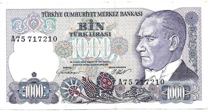 7.Emisyon / 1.Tertip / 1.000 Lira Seri Numarası : A 75 717210 Kondisyon : (ÇA) Çil Altı Puanlama : 10,00 / 9.50 NOT : Paranın ön yüz sol alt kulakta çok az miktarda sararma, ortada belli belirsiz kat izi mevcut.