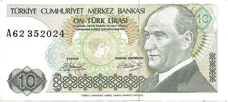 7.Emisyon / 1.Tertip / 10 Lira - Kısa Kaş Seri Numarası : A 62 352024 Kondisyon : (ÇA) Çil Altı Puanlama : 10,00 / 9.75 NOT : Paranın baskısı kağıdın üst tarafına yakın yapılmış. Kısa Kaş