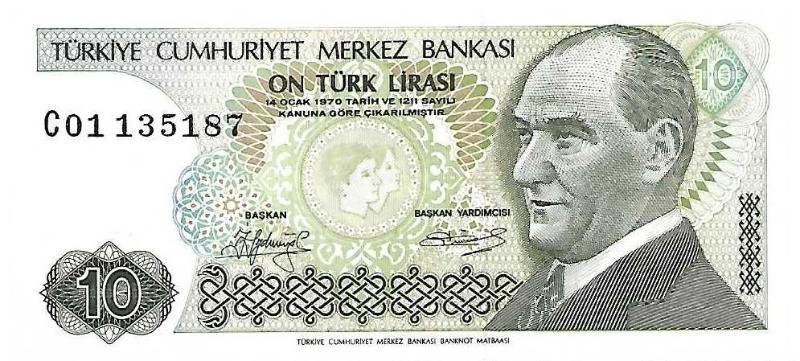 7.Emisyon / 1.Tertip / 10 Lira - Kısa Kaş Seri Numarası : C 01 135187 Kondisyon : (ÇİL) Çil Puanlama : 10,00 / 10.00 NOT : Kısa Kaş.