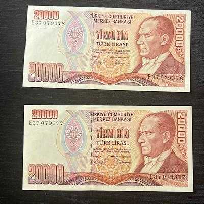 7.Emisyon 1.Tertip 20.000 Lira E37 Serisi 2 Adet ÇiL Seri Takipli başlıklı ürün, Efemera, Müzik, Sinema > Nümismatik, Para, Madalya > Kağıt Paralar > Cumhuriyet Dönemi > 7. Emisyon kategorisi altında İkinci El olarak satılmaktadır.