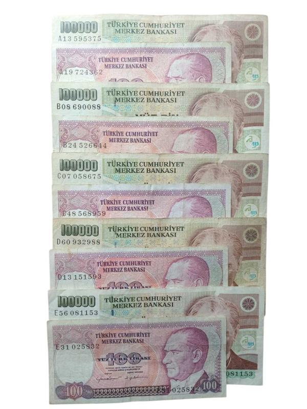 7. Emisyon 100.000 ve 100 Türk Lirası ABCDE Harf Serili 10 Adet Koleksiyon Kağıt Para.