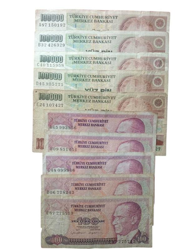 7. Emisyon 100.000 ve 100 Türk Lirası ABCDE Harf Serili 10 Adet Koleksiyon Kağıt Para.