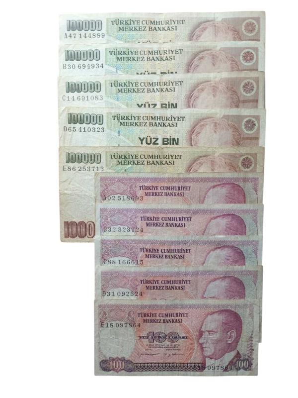 7. Emisyon 100.000 ve 100 Türk Lirası ABCDE Harf Serili 10 Adet Koleksiyon Kağıt Para.