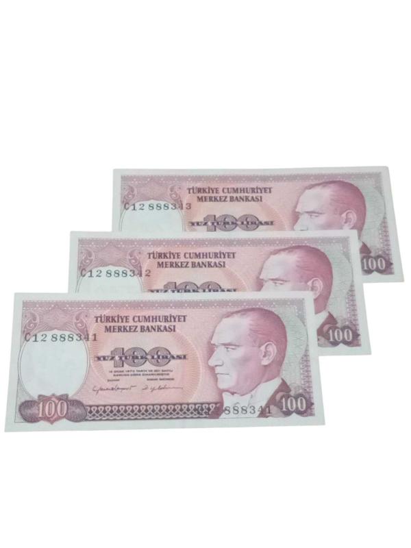 7. Emisyon 100 Türk Lirası 3 Adet Sıralı Takipli Koleksiyon Kağıt Para. Cumhuriyet Dönemi Para.