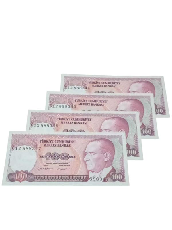 7. Emisyon 100 Türk Lirası 4 Adet Sıralı Takipli Koleksiyon Kağıt Para. Cumhuriyet Dönemi Para.