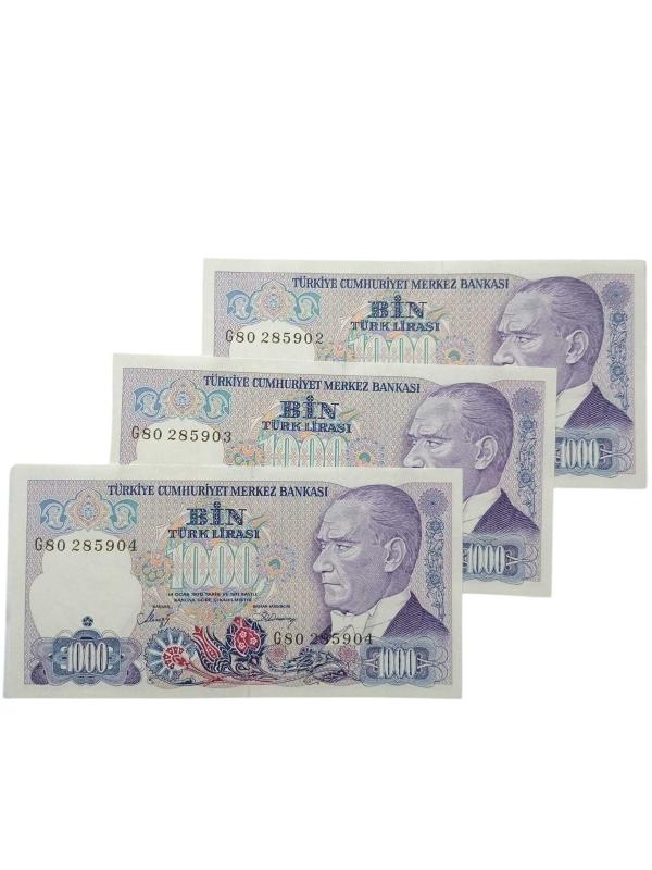 7. Emisyon 1000 Türk Lirası 3 Adet Sıralı Cumhuriyet Dönemi Koleksiyon Kağıt Para.