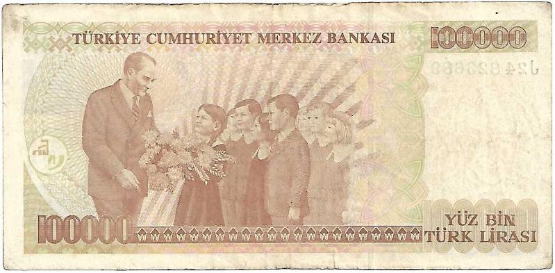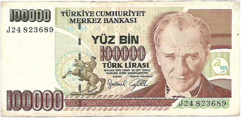 7.Emisyon / 3.Tertip / 100.000 Lira . Seri Numarası : J 24 823689 Kondisyon : (O) Orta . . NOT : Paranın kenarlarında az da olsa sararma mevcuttur. Alt orta kısımında 4 mm.kadar yırtık mevcuttur.