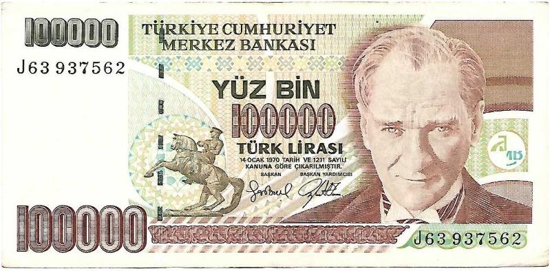 7.Emisyon / 3.Tertip / 100.000 Lira Seri Numarası : J 63 937562 Kondisyon : (İ) İyi Puanlama : 10,00 / 9.50 NOT : Paranın ön yüz sağ alt kulakta çok az miktarda sararma mevcut. Arka yüz sol alt kulakta çok az miktarda sararma mevcut.
