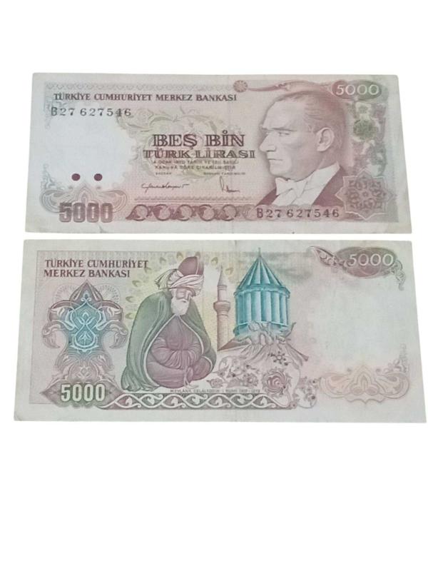 7. Emisyon 5000 Türk Lirası Mevlana Koleksiyon Kağıt Para. Cumhuriyet Dönemi Para.