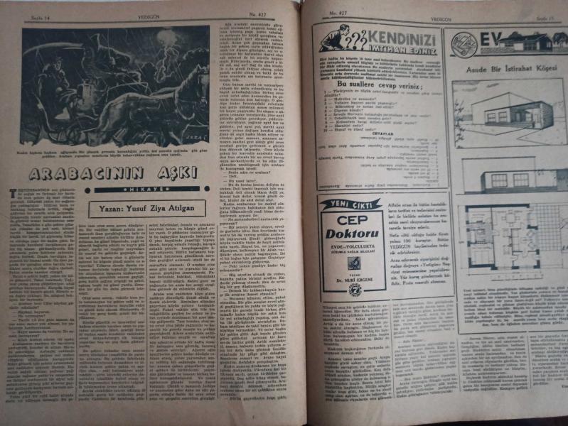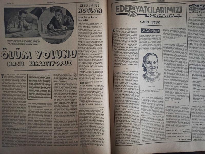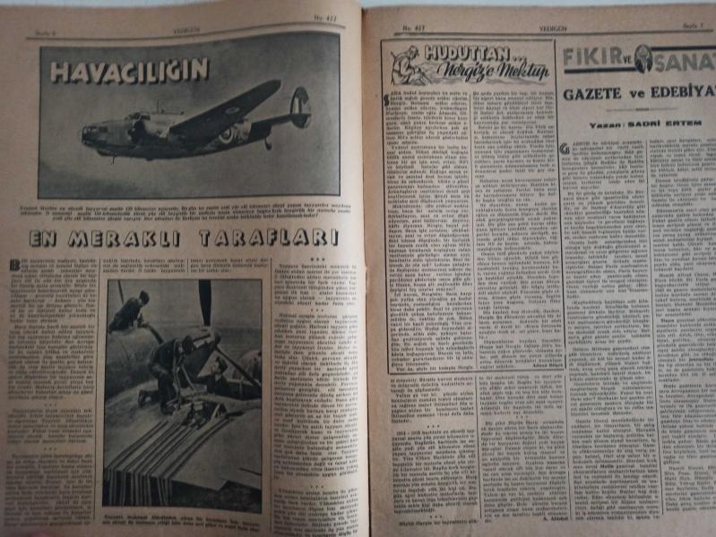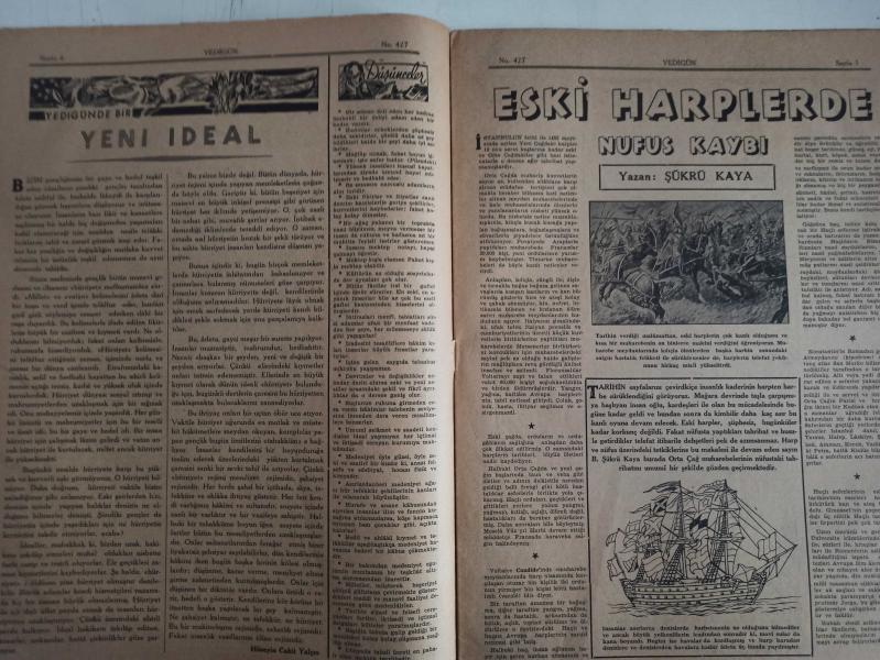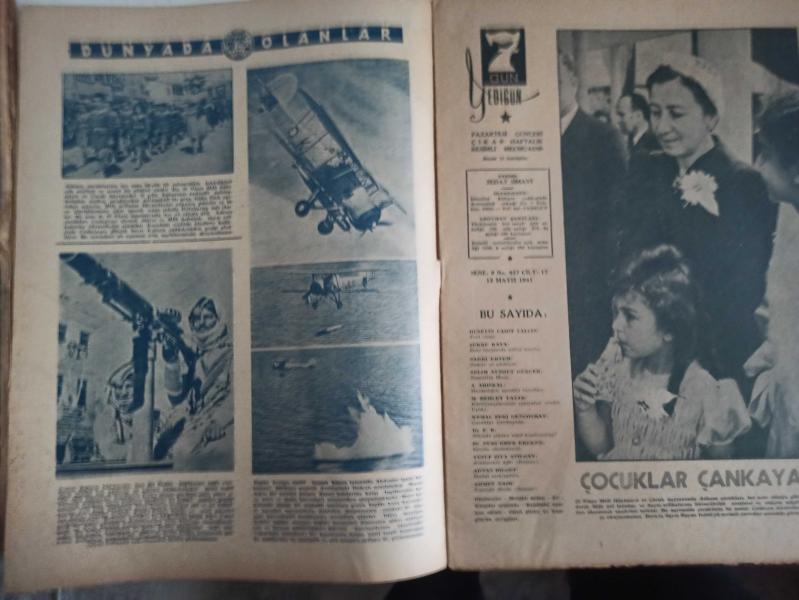 7 Gün Haftalık Aktüalite Sinema Tiyatro Müzik ve Magazin Dergisi - 12 Mayıs 1941 - Yıl:9 - Sayı:427 - Dünyada Olanlar - Çocuklar Çankaya'da - Yedigünde Bir Yeni İdeal - Düşünceler - Eski Harplerde Nüfus Kaybı - Şükrü Kaya - Havacılığın En Meraklı Tarafları - Huduttan Nergiz'e Mektup - Fikir ve Sanat - Gazete ve Edebiyat - Sadri Ertem - Nasrettin Hoca - Büyük Keşifler - Havagazı Nasıl Bulundu - Topu Kim İcat Etti - Ev Doktoru Diyor Ki - Ellerin Ehemmiyeti - Nuri Ergene - Minimini asker - Çocuklar Çankaya'da - Ölüm Yolunu Nasıl Kısaltıyoruz - Meraklı Notlar - Asma Bahçe Kuran Karıncalar - Edebiyatçılarımızı Tanıyalım - Cahit Uçuk - Behçet Yazar - Kitaplar Arasında - Garip - Arabacının Aşkı - Yusuf Ziya Atılgan - Kendinizi İmtihan Ediniz - Asude Bir İstirahat Köşesi - Büyük Memleket Romanı - Toprağa Dönüş - Ahmet Naim - Güzel Şiirler - Yedigün'ün Cevapları - Tungsram Ampul Reklamı - Arlon Saat Reklamı fotoğraf ve haberi - Tam Takım Dergi Yıpranma, sararmalar, kupon kesiği ve yırtılmalar zamana bağlı olarak görülebilir