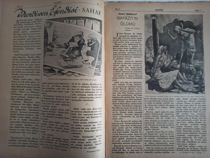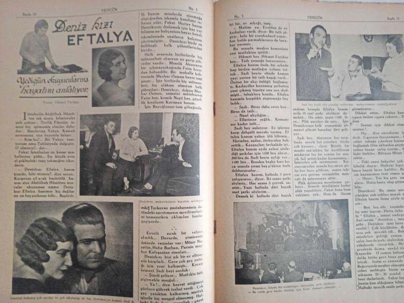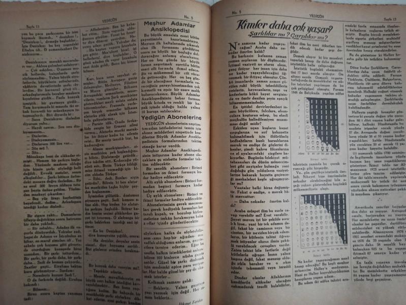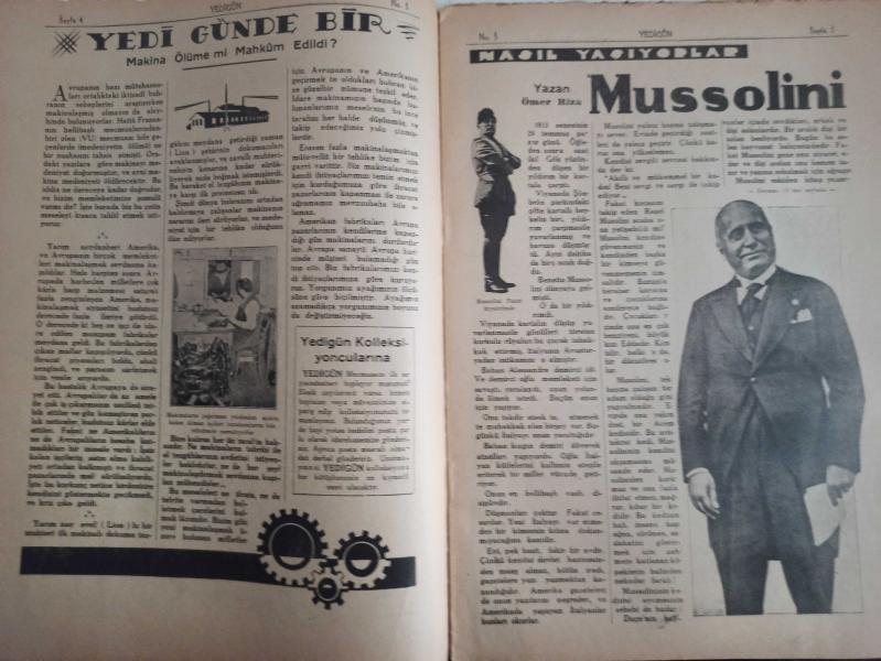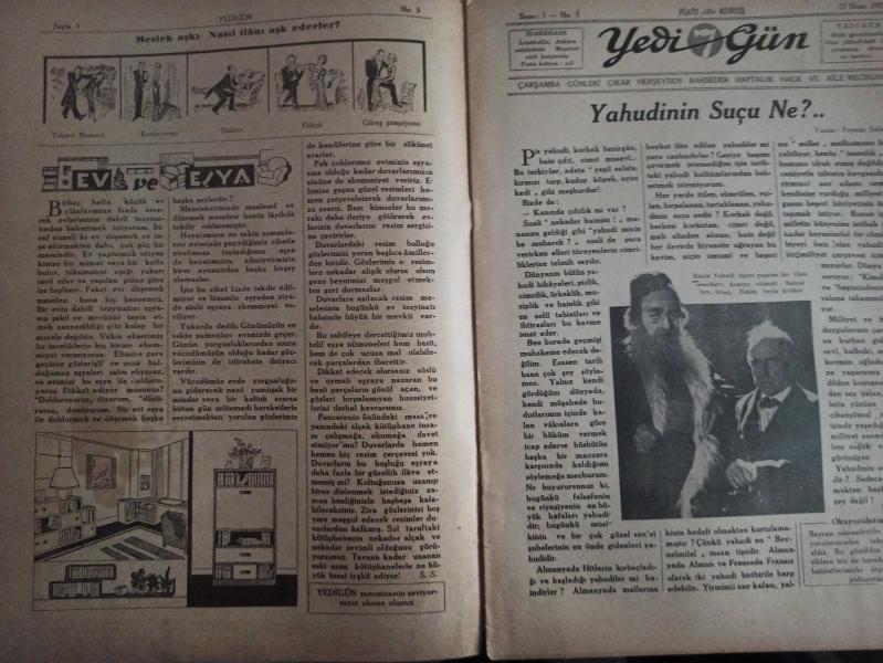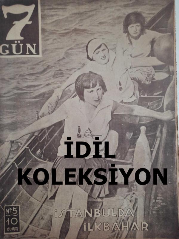 7 Gün Haftalık Aktüalite Sinema Tiyatro Müzik ve Magazin Dergisi - 12 Nisan 1933 - Yıl:1 Sayı:5 - İstanbul'da İlkbahar - Ev ve Eşya - Meslek Aşkı: Nasıl İlanı Aşk Ederler? - Yahudinin Suçu Ne? - Yedigünde Bir - Makine Ölüme mi Mahkum Edildi? - Nasıl Yaşıyorlar - Mussolini - Ömer Riza - Merdiven Efendisi: Sahaf - Nasıl Öldüler? - Bayazıt'ın Ölümü - Veba Teyze - Gelecek Nüshalarımızda! - Deniz Kızı Eftalya - Yedigün Okuyucularına hayalini anlatıyor - Hikmet Feridun - Kimler Daha Çok Yaşar? - Şarklılar mı? Garplılar mı? - Küçük Hikaye - Ucuz İlaç - Sadri Etem - Fuji-Yama Seyahat ve Aşk Romanı - Sedat Simavi - Anahtar Müsabakasında Kazananlar - Küme Müsabakasında Kazananlar - Yazı Tahlilleri - Sorun Cevap Verelim - Liliyan Harvey Amerika'da - Amerika'da Yeni Bir Oyun İcat Edildi fotoğraf ve haberi - Tam Takım Dergi Yıpranma, sararmalar, kupon kesiği ve yırtılmalar zamana bağlı olarak görülebilir