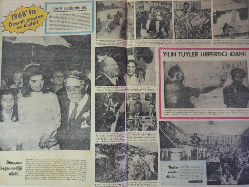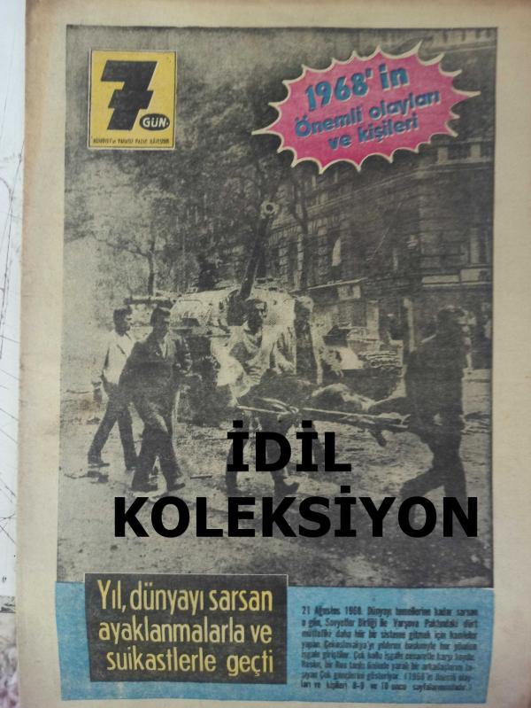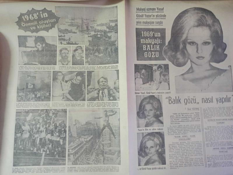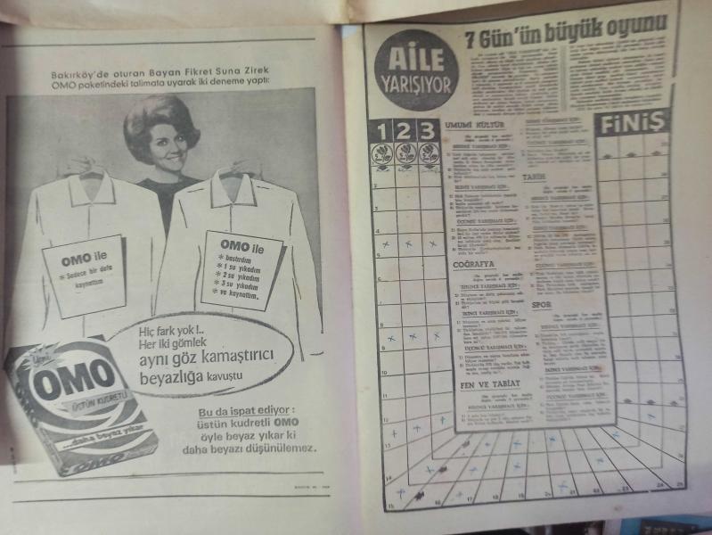 7 Gün Haftalık Aktüalite Sinema Tiyatro Müzik ve Magazin Dergisi - 1968'in Önemli olayları ve kişileri - Yıl, dünyayı sarsan ayaklanmalarla ve suikastlerle geçti - 1968'in Önemli Olayları ve Kişileri - Yılın Tüyler Ürpertici İdamı - 1969'un Makyajı: Balık Gözü Nasıl Yapılır? - Fay Deterjan Reklamı - Kadınlar kadar düşkün oldular - İngiliz erkekleri güzellikleri için 250 milyon lira harcadılar - Boşanma sebepleri üzerinde yapılan yeni araştırmalar - Hanımlar Neye Merakınız Var - Bir Anket - Kadın Nelerden Hoşlanmaz - Bilen Parmağını Kaldırsın - Çocuklar Sizin İçin - Çoban Kızının Ateş Böceği - Herşeyin bir nedeni var - Babasının beş kuruşuna muhtaç olmadan yüksek tahsil yapıyor - Ortaokuldan beri ayakkabı boyacısı - Bugün de Gülelim - Üngörmüşler Çizgi Romanı - Nazmiye Demirel'in Çilesi: Başbakan Hanımı Olmak - Eski Günler Hayal Oldu - Aile Yarışıyor - 7 Gün'ün büyük oyunu - Omo Deterjan Reklamı - Bizimkiler ve Fatoş Çizgi Romanı fotoğraf ve haberi - Tam Takım Dergi Yıpranma, sararmalar, kupon kesiği ve yırtılmalar zamana bağlı olarak görülebilir