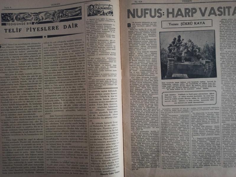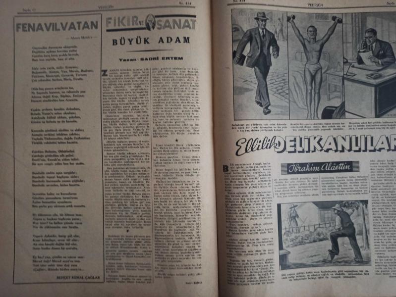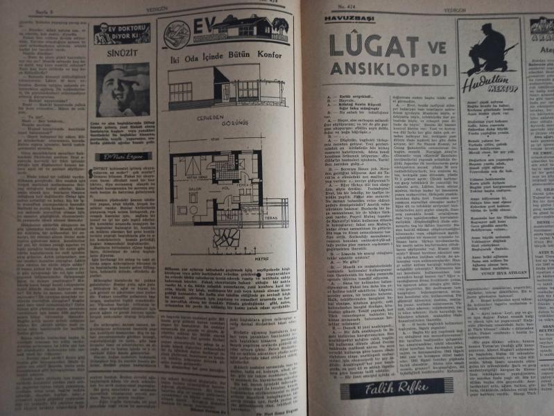 7 Gün Haftalık Aktüalite Sinema Tiyatro Müzik ve Magazin Dergisi - 21 Nisan 1941 - Yıl:9 - Sayı:424 - Dünyada Olanlar - Daima Hazır - Yedigünde Bir Telif Piyeslere Dair - Düşünceler - Nüfus: Harp Vasıtası - Şükrü Kaya - Yeni Tiyatro Neslimizin 2 Yıldızı - Ev Doktoru Diyor Ki - Sinüzit - İki ODa İçinde Bütün Konfor - Nuri Ergene - Falih Rıfkı - Lugat ve Ansiklopedi - Kitaplar Arasında - Ateş Ağacı - Huduttan Mektup - Ankara Kalesi - Ertuğrul Şevket - Fena Vilvatan - Fikir ve Sanat - Büyük Adam - Sadri Ertem - Ellilik Delikanlılar - İbrahim Alaettin - İstanbul Kapıları - Selim Nüzhet Gerçek - Edebiyatçılarımızı Tanıyalım - Ruşen Eşref Ünaydın - Behçet Yazar - Güzel Şiirler - Okuma Tekniği - Vahdet Gültekin - Tombul Teyze Albümü - Doktor Hataları - Kendinizi İmtihan Ediniz - Yedigün'ün Cevapları - Hürriyet Apartmanı - Tungsram Ampul Reklamı - Arlon Saat Reklamı fotoğraf ve haberi - Tam Takım Dergi Yıpranma, sararmalar, kupon kesiği ve yırtılmalar zamana bağlı olarak görülebilir