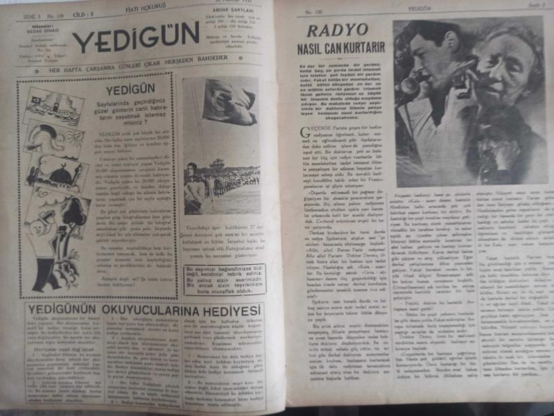 7 Gün Haftalık Aktüalite Sinema Tiyatro Müzik ve Magazin Dergisi - 26 Haziran 1935 - Radyo Nasıl Can Kurtarır - Kadın ve Deniz - Amerikan Kız Kolejinde - Suad Arık - Mumya Türklerin İcadıdır - Afrika Ormanlarında Bir Aşk Macerasının Kahramanı Olan Zürafe - Apollon 1935 - Altın Olta - On Yılın Hikayesi - Hüseyin Cahid Yalçın - Mezamir - Yaz Hikayesi - Selami İzzet Kayacan - Yaz Sağlık Öğütleri - Foya Romanı - Edhem İzzet Benice - İtalya Habeş - Malta Adasında Esaret Hatıraları - Ucuz Makinaların En Kibarı - Eskişehir'in Hasan Beyi - Güzel Süvari - Deniz Safası Sürünüz Johnson - Frigidaire Soğuk Hava Dolabı Reklamı fotoğraf ve haberi - Tam Takım Dergi Yıpranma, sararmalar, kupon kesiği ve yırtılmalar zamana bağlı olarak görülebilir