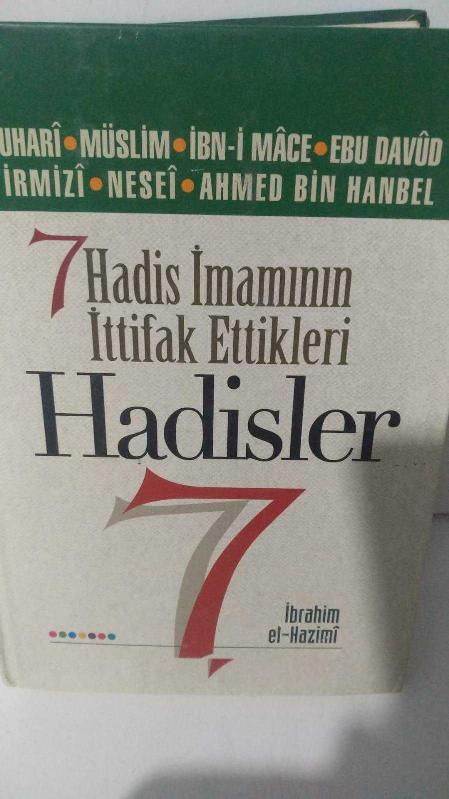 7 HADİS İMAMININ İTTİFAK ETTİKLERİ HADİSLER (BUHARİ-MÜSLİM-İBN- MACE-EBU DAVUD-TİRMİZİ-NESEİ-AHMED BİN HANBEL)2.EL, İBRAHİM B.ABDULLAH EL-HAZİMİ tarafından kaleme alınmıştır. Kitap 2006 yılında POLEN tarafından yayınlanmıştır. Bu baskının çevirisi HANİFİ AKIN tarafından yapılmıştır. 858 sayfadır. 7 HADİS İMAMININ İTTİFAK ETTİKLERİ HADİSLER (BUHARİ-MÜSLİM-İBN- MACE-EBU DAVUD-TİRMİZİ-NESEİ-AHMED BİN HANBEL)2.EL adlı eser Türkçe dilindedir.