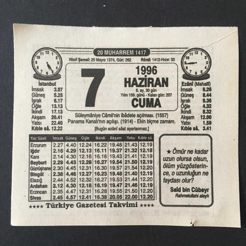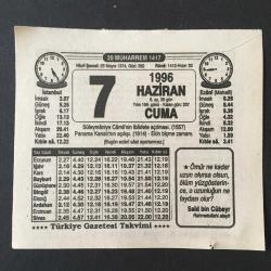 7 HAZİRAN 1996 -TAKVİM YAPRAĞI-DOĞUM GÜNÜ HEDİYESİ-TÜRKİYE GAZETESİ TAKVİMİ,SÜLEYMANİYE CAMİİ NİN İBADETE AÇILMASI 1557,PANAMA KANALININ AÇILIŞI 1914,EKİN BİÇME ZAMANI,ŞEYTANIN DÜŞMANLARI,SÜLEYMANİYE CAMİİ başlıklı ürün, Efemera, Müzik, Sinema > Belge ve Evraklar > Takvimler kategorisi altında İkinci El olarak satılmaktadır.