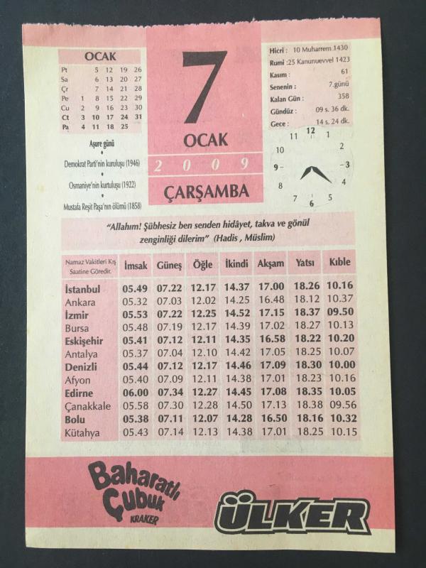7 OCAK 2009 -TAKVİM YAPRAĞI-DOĞUM GÜNÜ HEDİYESİ-ÜLKER TAKVİMİ,DEMOKRAT PARTİNİN KURULUŞU 1946,OSMANİYENİN KURTULUŞU 1922,MUSTAFA REŞİT PAŞANIN ÖLÜMÜ 1858,BİSİKLETLE EN YÜKSEK RAKIMDA,BİBERİYE YAPRAĞI,SELAMDAN ÖTE,GÜNÜN MENÜSÜ,ÇOCUĞUNUZUN İSMİ,BİZ NE YAPABİLİRİZ EVDE,CAM VAZOLAR,AŞURE başlıklı ürün, Efemera, Müzik, Sinema > Belge ve Evraklar > Takvimler kategorisi altında İkinci El olarak satılmaktadır.