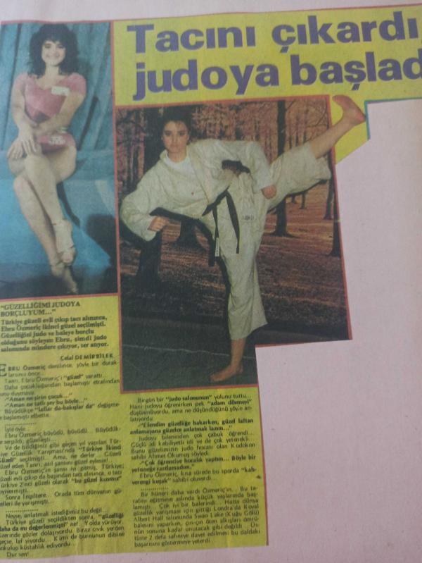 7 Ocak 1984 - Tacını çıkardı, judoya başladı - Türkiye güzeli evli çıkıp tacı alınınca, Ebru Özmeriç ikinci güzel seçilmişti. Güzelliğini judo ve baleye borçlu olduğunu söyleyen Ebru, şimdi judo salonunda mindere çıkıyor ve ter atıyor - Gazete Haberi - Tek Yaprak Arkalı Önlüdür adlı eser, Kitap > Süreli Yayınlar > Dergiler > Spor kategorisinde İkinci El olarak satıştadır.