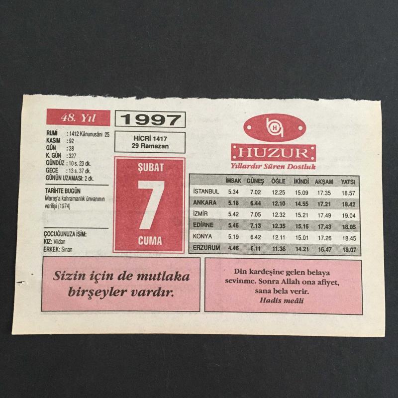 7 ŞUBAT 1997-TAKVİM YAPRAĞI-DOĞUM GÜNÜ HEDİYESİ-HUZUR TAKVİMİ,MARAŞA KAHRAMANLIK ÜNVANI VERİLİŞİ,1974ÇOCUĞUNUZA İSİM,ŞÜKÜR VAZİFEMİZ,HAYVANLARA ŞEFKAT,MARUL