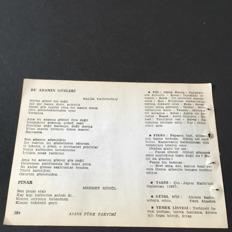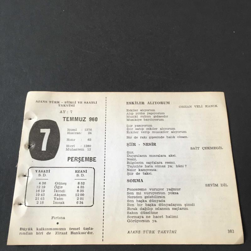 7 TEMMUZ 1960 -TAKVİM YAPRAĞI-DOĞUM GÜNÜ HEDİYESİ-AJANS TÜRK-ŞİİRLİ VE SAATLİ TAKVİMİ,ORHAN VELİ KANIK,SAİT ÇEKMEGİL,SEVİM DİL,HALİM YAĞCIOĞLU,MEHMET GÖNÜL,FAL,FIKRA,ÇİN JAPON HARBİNİN BAŞLAMASI 1937,GÜZEL SÖZ,YEMEK LİSTESİ başlıklı ürün, Efemera, Müzik, Sinema > Belge ve Evraklar > Takvimler kategorisi altında İkinci El olarak satılmaktadır.