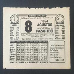 8 AĞUSTOS 1994 -TAKVİM YAPRAĞI-DOĞUM GÜNÜ HEDİYESİ-FATİH HAK VE HİZMET VAKFI TAKVİMİ,4.MEHMED İN TAHTA ÇIKIŞI 1648,BİTLİSİN KURTULUŞU,HAKKINI HELAL ET, en son 8 ay önce güncellenmiştir.