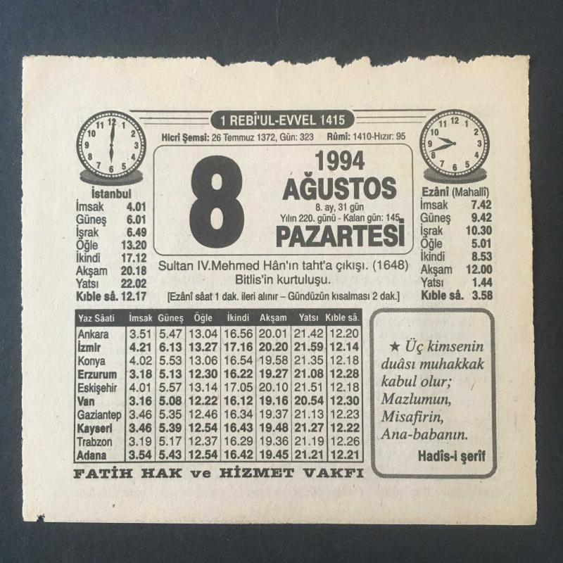 8 AĞUSTOS 1994 -TAKVİM YAPRAĞI-DOĞUM GÜNÜ HEDİYESİ-FATİH HAK VE HİZMET VAKFI TAKVİMİ,4.MEHMED İN TAHTA ÇIKIŞI 1648,BİTLİSİN KURTULUŞU,HAKKINI HELAL ET başlıklı ürün, Efemera, Müzik, Sinema > Belge ve Evraklar > Takvimler kategorisi altında İkinci El olarak satılmaktadır.